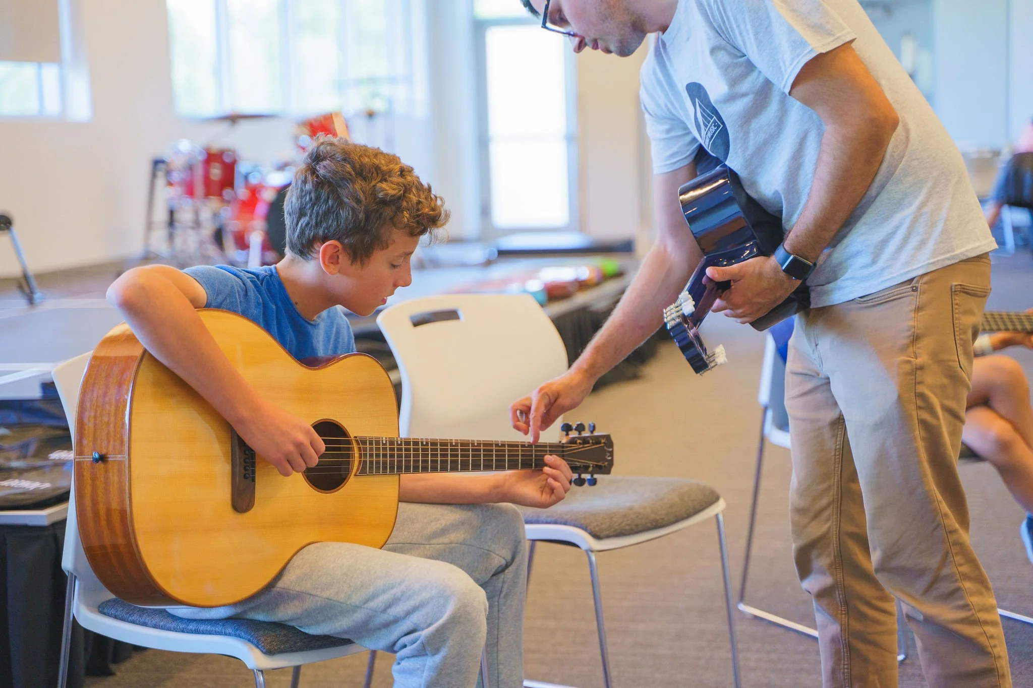 Children sitting on chairs in a music classroom, each holding or playing a guitar, with a focus on a young boy in the foreground playing an acoustic guitar.